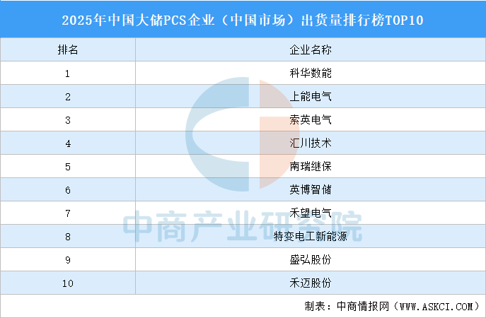 2025年中國大儲(chǔ)PCS企業(yè)(中國市場)出貨量排行榜TOP10分別為:科華數(shù)能、上能電氣、索英電氣、匯川技術(shù)、南瑞繼保、英博智儲(chǔ)、禾望電氣、特變電工新能源、盛弘股份、禾邁股份。