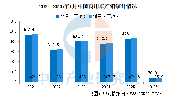 2026年1月,商用車產(chǎn)銷分別完成38.8萬輛和35.9萬輛,同比分別增長(zhǎng)29.9%和23.5%,環(huán)比分別下降6.8%和15.6%。