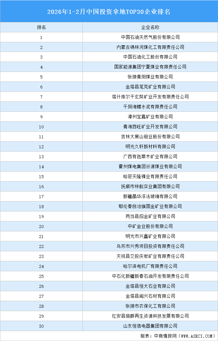 據(jù)中商產(chǎn)業(yè)研究院產(chǎn)業(yè)地產(chǎn)情報(bào)庫(kù)監(jiān)測(cè)數(shù)據(jù)顯示:2026年1-2月全國(guó)投資拿地TOP30企業(yè)排行榜已揭曉。榜單顯示,2026年1-2月我國(guó)投資拿地前十企業(yè)分別為:中國(guó)石油天然氣股份有限公司、內(nèi)蒙古錫林河化工有限責(zé)任公司、中國(guó)石油化工股份有限公司、國(guó)家能源集團(tuán)寧夏煤業(yè)有限責(zé)任公司、張掖青陽(yáng)煤業(yè)有限公司、金塔縣筆克礦業(yè)有限公司、塔什庫(kù)爾干玄奘礦業(yè)開發(fā)有限責(zé)任公司、千陽(yáng)海螺水泥有限責(zé)任公司、漳州寶嘉礦業(yè)有限公司、青海西旺礦業(yè)開發(fā)有限公司。其中,中國(guó)石油天然氣股份有限公司產(chǎn)業(yè)用地投資最活躍,2026年1-2月其產(chǎn)業(yè)用地拿地面積排名全國(guó)第一。
