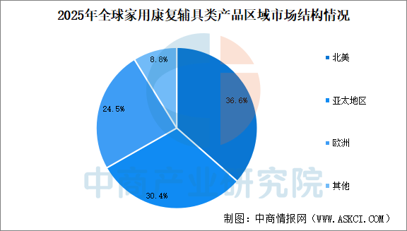 北美消費能力強是全球家用康復輔具類產(chǎn)品最大市場,2025年北美家用康復輔具類產(chǎn)品市場規(guī)模占全球比重的36.6%。亞太地區(qū)增速最快,家用康復輔具類產(chǎn)品市場規(guī)模占比30.4%。歐洲以中高端產(chǎn)品為主,家用康復輔具類產(chǎn)品市場規(guī)模占比24.5%。