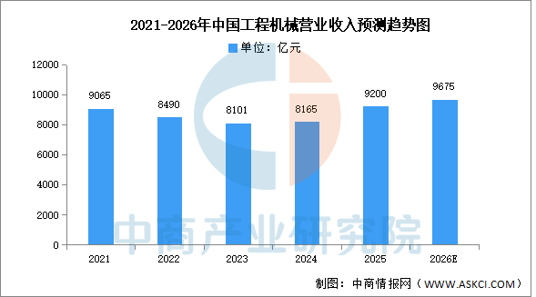中商產(chǎn)業(yè)研究院發(fā)布的《2025-2030年中國(guó)工程機(jī)械市場(chǎng)需求預(yù)測(cè)及發(fā)展趨勢(shì)前瞻報(bào)告》顯示,2024年,工程機(jī)械行業(yè)實(shí)現(xiàn)營(yíng)業(yè)收入8165億元,同比增長(zhǎng)0.79%,2025年超過(guò)9000億元。中商產(chǎn)業(yè)研究院分析師預(yù)測(cè),2026年中國(guó)工程機(jī)械營(yíng)收將達(dá)到9675億元。