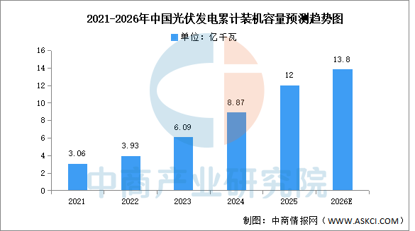 中商產(chǎn)業(yè)研究院發(fā)布的《2025-2030年太陽(yáng)能光伏行業(yè)市場(chǎng)調(diào)研及投資前景預(yù)測(cè)報(bào)告》顯示,截至2025年12月,全國(guó)光伏發(fā)電裝機(jī)容量達(dá)到12億千瓦,同比增長(zhǎng)35%,其中集中式光伏6.7億千瓦,分布式光伏5.3億千瓦。中商產(chǎn)業(yè)研究院分析師預(yù)測(cè),2026年全國(guó)光伏發(fā)電裝機(jī)容量將達(dá)13.8億千瓦。