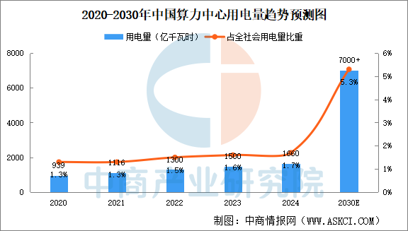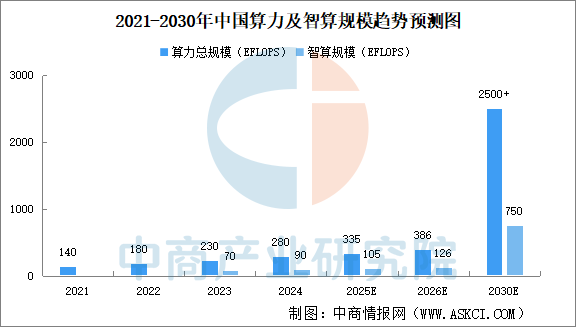 當前,數(shù)字經濟呈爆發(fā)式增長態(tài)勢,人工智能等新興技術的廣泛應用推動算力需求呈指數(shù)級攀升,帶動算力中心規(guī)模與耗電量急劇擴大。中國信通院發(fā)布的數(shù)據(jù)顯示,截至2024年底,我國算力總規(guī)模達280EFLOPS(每秒百億億次浮點運算),其中智能算力規(guī)模達90EFLOPS,占比32%。盤古智庫發(fā)布《中國算力與能耗研究報告暨2030年發(fā)展預測》報告預測,“十五五”期間,中國算力年均增長速度將保持在35%以上,到2030年中國算力總規(guī)模將突破2500EFLOPS。中商產業(yè)研究院分析師預測,根據(jù)智能算力規(guī)模占比30%計算,預計到2030年中國智能算力總規(guī)模將達到750EFLOPS。