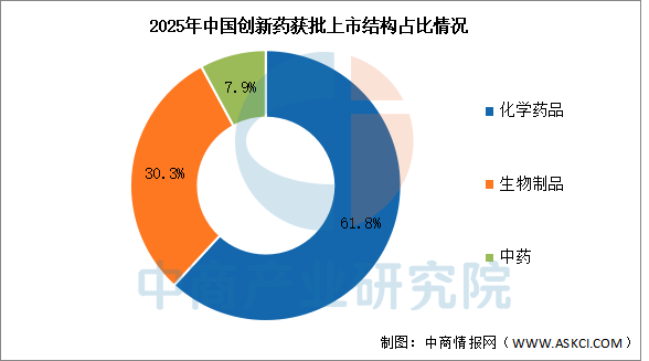 2025年國(guó)家藥監(jiān)局批準(zhǔn)上市的76個(gè)創(chuàng)新藥中,化學(xué)藥品數(shù)量最多,共47個(gè),占比達(dá)61.8%。生物制品和中藥分別占比30.3%和7.9%。