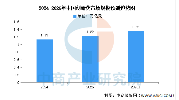 中商產(chǎn)業(yè)研究院發(fā)布的《2025-2030年中國(guó)創(chuàng)新藥產(chǎn)業(yè)深度研究及發(fā)展前景投資預(yù)測(cè)分析報(bào)告》數(shù)據(jù)顯示,2024年中國(guó)創(chuàng)新藥市場(chǎng)規(guī)模1.13萬(wàn)億元,政策全鏈條支持與研發(fā)投入持續(xù)加碼是核心驅(qū)動(dòng)力,2025年約為1.22萬(wàn)億元。中商產(chǎn)業(yè)研究院分析師預(yù)測(cè),到2026年,中國(guó)創(chuàng)新藥市場(chǎng)規(guī)模將超過1.3萬(wàn)億元。