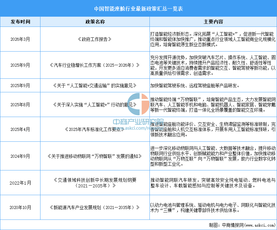 近年來,我國(guó)發(fā)布了《汽車行業(yè)穩(wěn)增長(zhǎng)工作方案(2025—2026年)》《關(guān)于“人工智能+交通運(yùn)輸”的實(shí)施意見》《關(guān)于深入實(shí)施“人工智能+”行動(dòng)的意見》等政策文件,從技術(shù)攻關(guān)、產(chǎn)業(yè)應(yīng)用、標(biāo)準(zhǔn)規(guī)范等方面為智能座艙行業(yè)提供制度保障,明確了L3級(jí)準(zhǔn)入、人工智能深度融合、關(guān)鍵軟硬件自主可控等發(fā)展路徑,推動(dòng)智能座艙產(chǎn)業(yè)快速發(fā)展。