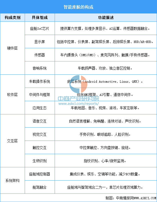 智能座艙是指通過集成高性能計(jì)算平臺(tái)、車載操作系統(tǒng)、多模態(tài)交互技術(shù)、人工智能算法及各類傳感器,為駕駛者和乘客提供安全、舒適、便捷且具備學(xué)習(xí)進(jìn)化能力的數(shù)字化車內(nèi)環(huán)境。智能座艙的核心價(jià)值在于實(shí)現(xiàn)從“被動(dòng)響應(yīng)”到“主動(dòng)服務(wù)”的轉(zhuǎn)變,通過感知用戶狀態(tài)與場(chǎng)景需求,主動(dòng)調(diào)節(jié)座艙功能,提供個(gè)性化體驗(yàn)。智能座艙由硬件層、軟件層、交互層、系統(tǒng)架構(gòu)四個(gè)層面構(gòu)成:
