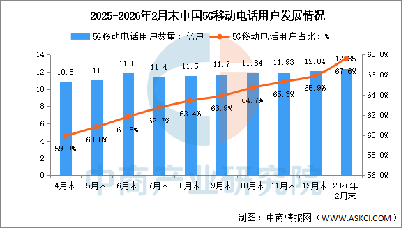 截至2月末,三家基礎(chǔ)電信企業(yè)及中國廣電的移動電話用戶總數(shù)達(dá)18.26億戶,比上年末減少100.1萬戶。其中,5G移動電話用戶達(dá)12.35億戶,比上年末凈增3044萬戶,占移動電話用戶的67.6%。