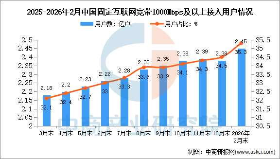 截至2月末,三家基礎(chǔ)電信企業(yè)的固定互聯(lián)網(wǎng)寬帶接入用戶總數(shù)達(dá)6.94億戶,比上年末凈增316.7萬戶。其中,100Mbps及以上接入速率的固定互聯(lián)網(wǎng)寬帶接入用戶達(dá)6.62億戶,占總用戶數(shù)的95.5%;1000Mbps及以上接入速率的固定互聯(lián)網(wǎng)寬帶接入用戶達(dá)2.45億戶,比上年末凈增637萬戶,占總用戶數(shù)的35.3%,占比較上年末提升0.8個百分點。