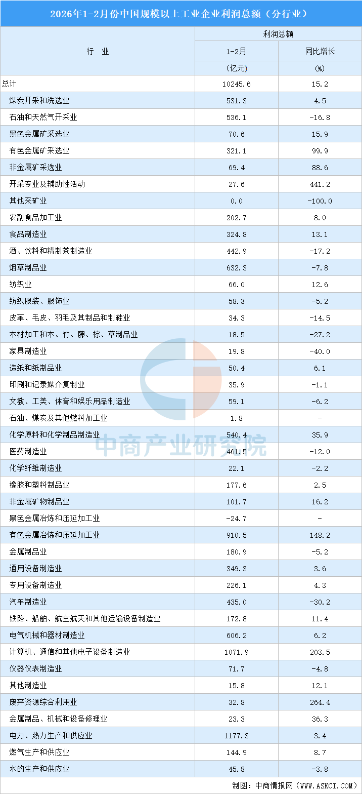 中商情報(bào)網(wǎng)訊:1—2月份,全國(guó)規(guī)模以上工業(yè)企業(yè)實(shí)現(xiàn)利潤(rùn)總額10245.6億元,同比增長(zhǎng)15.2%(按可比口徑計(jì)算)。