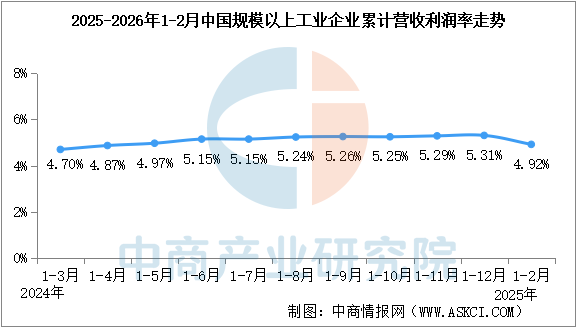 1—2月份,規(guī)模以上工業(yè)企業(yè)實(shí)現(xiàn)營(yíng)業(yè)收入20.84萬億元,同比增長(zhǎng)5.3%;發(fā)生營(yíng)業(yè)成本17.68萬億元,增長(zhǎng)5.0%;營(yíng)業(yè)收入利潤(rùn)率為4.92%,同比上升0.43個(gè)百分點(diǎn)。