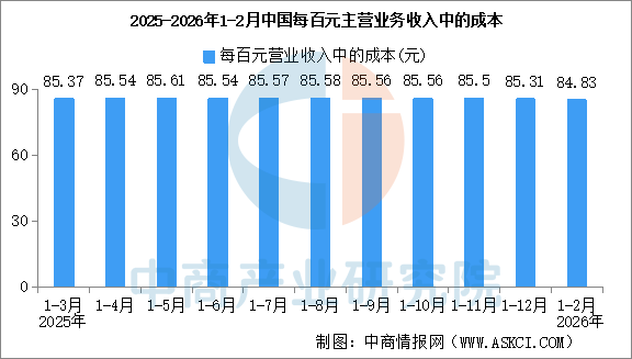 1—2月份,規(guī)模以上工業(yè)企業(yè)每百元營(yíng)業(yè)收入中的成本為84.83元,同比減少0.24元;每百元營(yíng)業(yè)收入中的費(fèi)用為8.66元,同比增加0.02元。