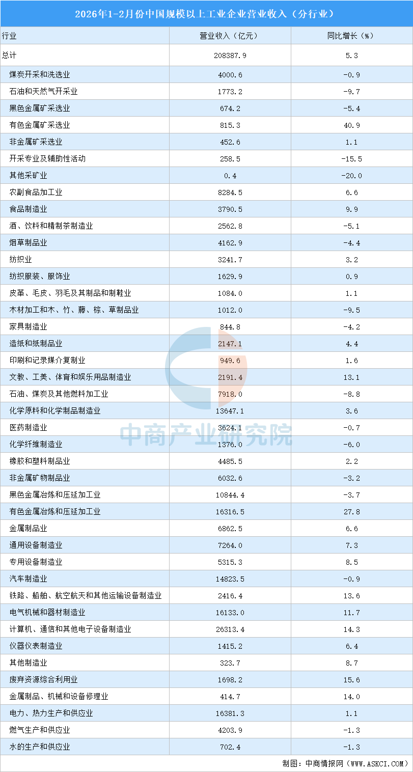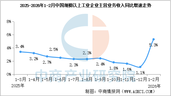 2026年1-2月全國(guó)規(guī)上工業(yè)企業(yè)營(yíng)業(yè)收入同比增長(zhǎng)5.3%(圖)