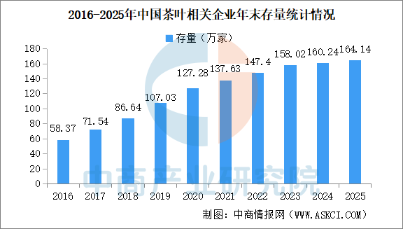 截至3月27日,國內(nèi)現(xiàn)存茶葉相關(guān)企業(yè)165.17萬家。近十年我國茶葉相關(guān)企業(yè)年末存量呈穩(wěn)步增長態(tài)勢,2016年末存量為58.37萬家,2019年末突破百萬,達107.03萬家;2020年-2025年保持穩(wěn)健增長,2025年末存量升至164.14萬家,較2016年增長約181.2%,反映出茶產(chǎn)業(yè)市場活力持續(xù)釋放。