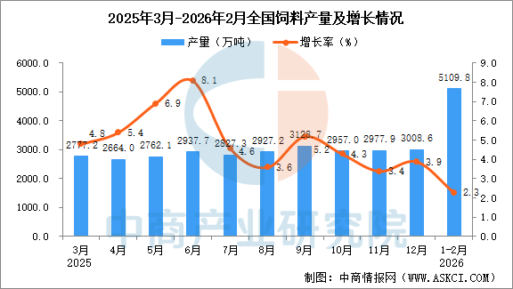 中商情報網(wǎng)訊:據(jù)中商產(chǎn)業(yè)研究院數(shù)據(jù)庫,2026年1-2月全國飼料當月產(chǎn)量與去年同期相比增長。2026年1-2月全國飼料產(chǎn)量為5109.8萬噸,同比增長2.3%。