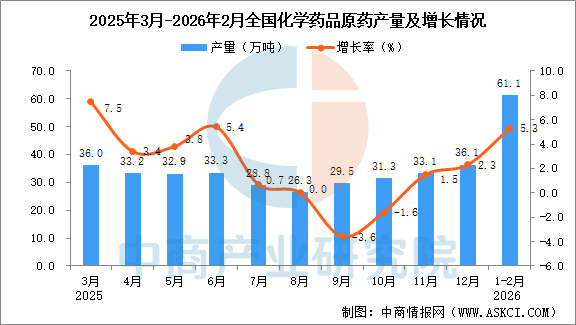 2026年1-2月全國(guó)化學(xué)藥品原藥產(chǎn)量增長(zhǎng)情況