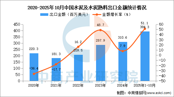 從金額方面來看,數(shù)據(jù)顯示,2025年1-10月中國水泥及水泥熟料出口金額394.3百萬美元,同比增長(zhǎng)51.1%。