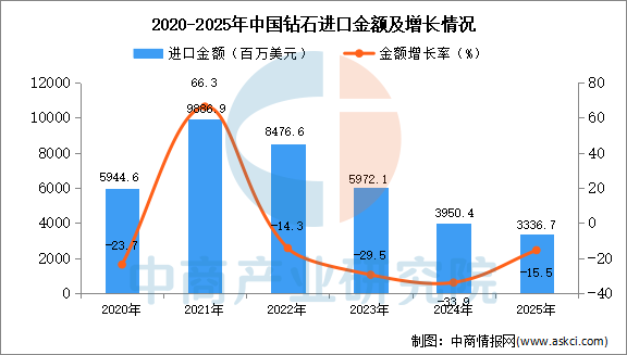 從金額方面來看,數(shù)據(jù)顯示,2025年1-12月中國鉆石進(jìn)口金額3336.7百萬美元,同比下降15.5%。