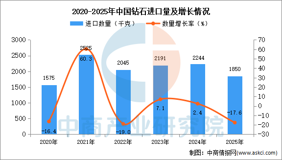 中商情報網(wǎng)訊:據(jù)中商產(chǎn)業(yè)研究院數(shù)據(jù)庫顯示,2024年中國鉆石進(jìn)口量2244萬噸,同比增長2.4%。最新數(shù)據(jù)顯示,2025年1-12月中國鉆石進(jìn)口量1850萬噸,同比下降17.6%。