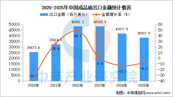 從金額方面來看,數(shù)據(jù)顯示,2025年1-12月中國成品油出口金額38307百萬美元,同比下降8.3%。