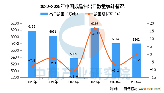 中商情報(bào)網(wǎng)訊:據(jù)中商產(chǎn)業(yè)研究院數(shù)據(jù)庫顯示,2024年我國成品油出口量5814萬噸,同比下降7.2%。2025年1-12月中國成品油出口量5802萬噸,同比下降0.2%。