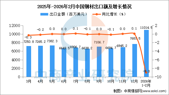 從金額方面來看,2026年1-2月中國鋼材出口金額11014.5百萬美元,同比下降9%;1-2月中國鋼材出口金額11014.5百萬美元,同比下降9%。