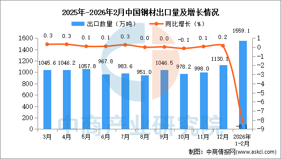 中商情報網(wǎng)訊:據(jù)中商產(chǎn)業(yè)研究院數(shù)據(jù)庫顯示,2026年1-2月中國鋼材出口量1559.1萬噸,同比下降8.1%;1-2月中國鋼材出口量1559.1萬噸,同比下降8.1%。