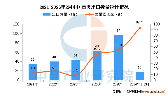 2026年1-2月中國肉類出口數(shù)據(jù)統(tǒng)計(jì)分析:出口量同比增長92.9%