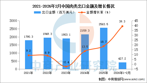 從金額方面來看,數(shù)據(jù)顯示,2026年1-2月中國肉類(包括雜碎)出口金額427.2百萬美元,同比增長39.3%。