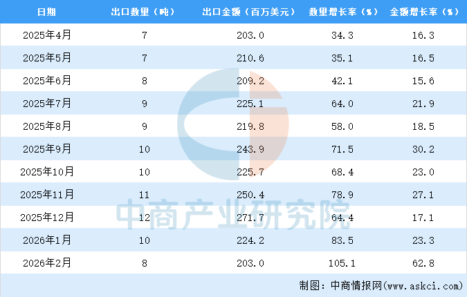 2026年2月中國肉類(包括雜碎)出口量及金額增長情況