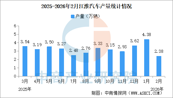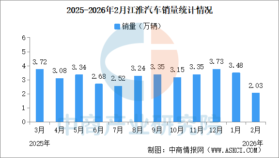 中商情報(bào)網(wǎng)訊:2026年2月,江淮汽車產(chǎn)量2.38萬輛,同比減少5.54%。銷量2.03萬輛,同比減少24.51%。2026年1-2月,江淮汽車?yán)塾?jì)產(chǎn)量6.76萬輛,同比增長12.14%。累計(jì)銷量5.51萬輛,同比減少11.78%。