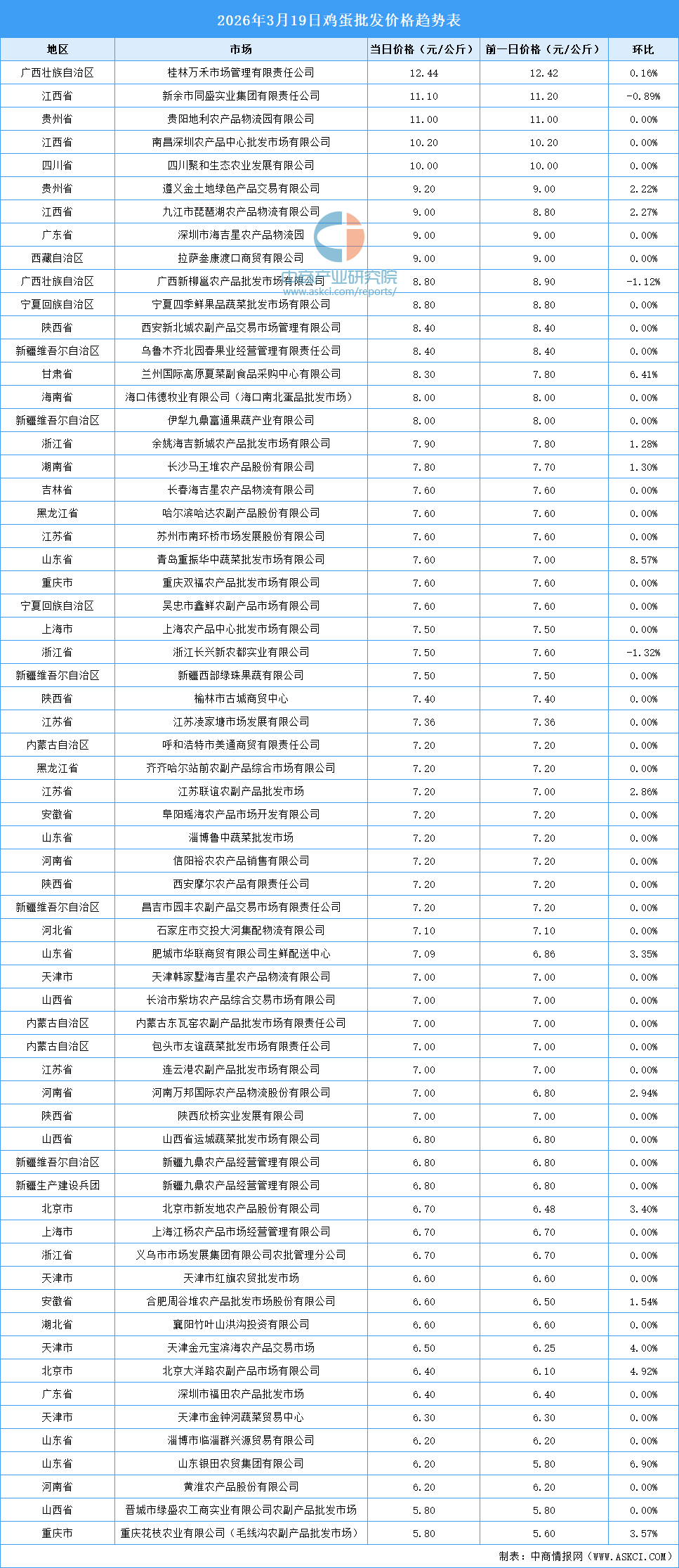 中商情報網(wǎng)訊:最新數(shù)據(jù)顯示:3月19日全國雞蛋平均價格為7.58元/公斤。其中,雞蛋價格最高的市場是桂林萬禾市場管理有限責(zé)任公司,當(dāng)日價格為12.44元/公斤,環(huán)比上漲0.16%。雞蛋價格最低的市場是晉城市綠盛農(nóng)工商實業(yè)有限公司農(nóng)副產(chǎn)品批發(fā)市場和重慶花枝農(nóng)業(yè)有限公司(毛線溝農(nóng)副產(chǎn)品批發(fā)市場),當(dāng)日價格均為5.80元/公斤。